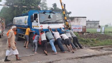 जमानिया बाईपास रेलवे क्रॉसिंग पर फंसा भारत पेट्रोलियम का ट्रक, बड़ी दुर्घटना टली